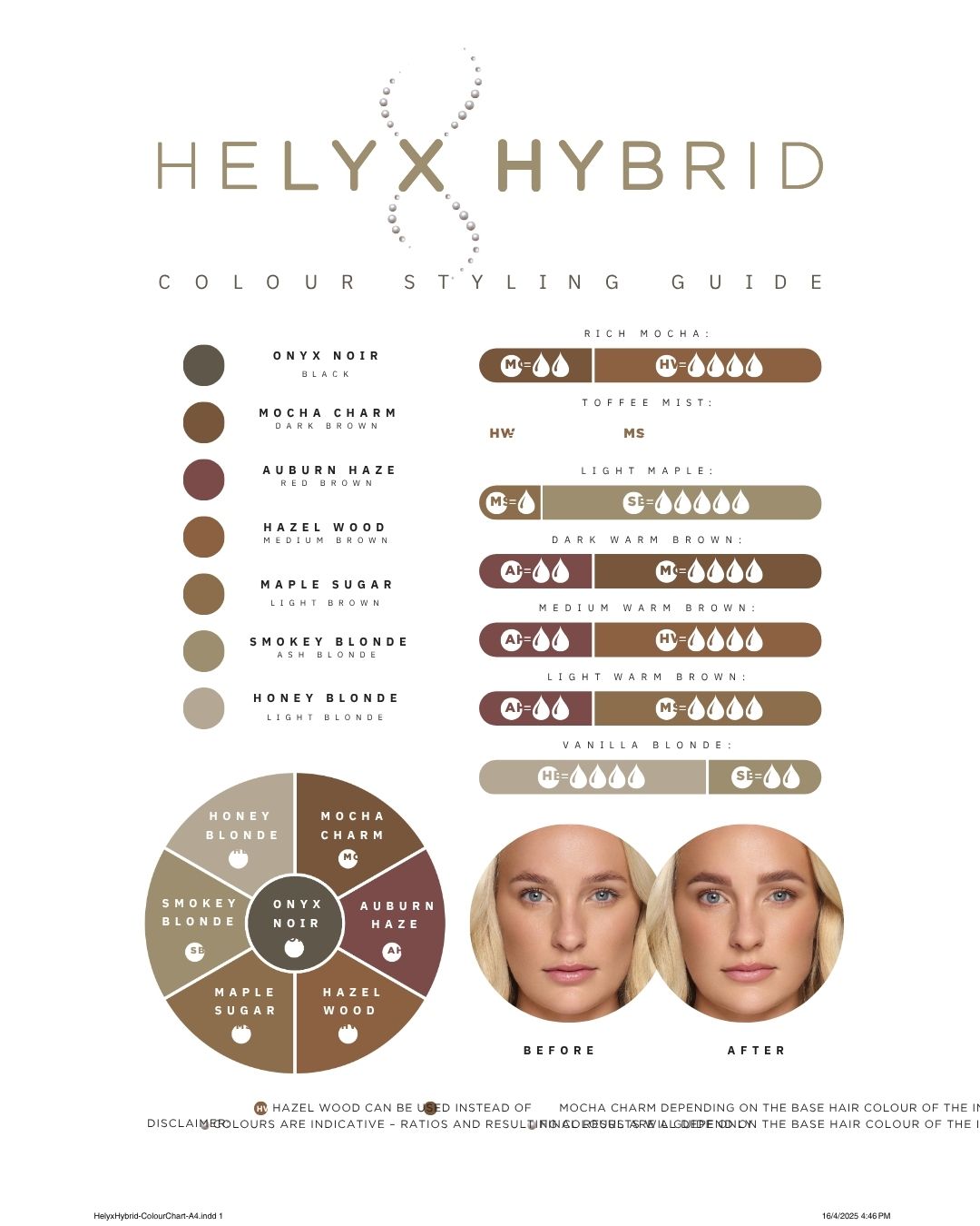 Helyx Hybrid je hibridni sustav bojanja koji omogućuje duboko prodiranje boje u strukturu dlake, čime se osiguravaju dugotrajni rezultati – slično trajnoj boji. Međutim, nudi dodatnu prednost: bojenje kože. Ovaj učinak na koži stvara vizualnu nijansu i osjećaj punoće obrva, čak i tamo gdje dlačice nedostaju ili gdje želimo naglasiti oblik. Rezultat? Savršeno oblikovane i definirane obrve koje traju – bez potrebe za mikrobladingom, tetovažama ili trajnom šminkom, koje s vremenom blijede.